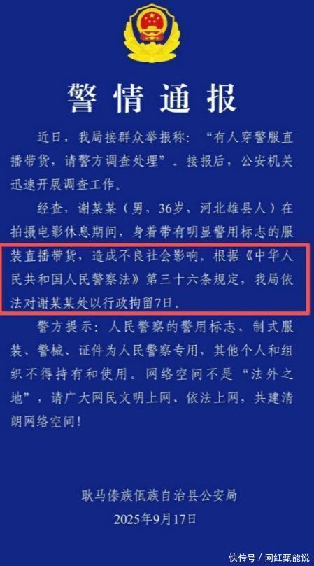 事后他赶忙进行了道歉,在视频中依旧没有认识到自己的错误,他称有人将自己的图片截取下来,进行涂鸦损害人民警察的形象,为此他郑重道歉。 这样的声明当然没人会买账,嘎子这完全是在甩锅,但好在他的报应很快就来了。 没过几天云南警方发布声明,谢孟伟因为身穿警服进行直播卖货被拘留7天,终于大快人心。